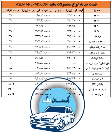 شرکت سایپا افزایش ۳۰ درصدی را بر قیمت انواع خودروهای خود اعمال کرد.