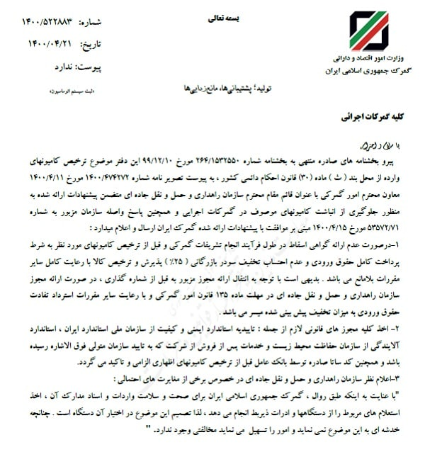 در این بخشنامه آمده: در صورت عدم ارائه گواهی اسقاط در طول فرآیند انجام تشریفات گمرکی و قبل از ترخیص کامیون‌های مورد نظر به شرط پرداخت کامل حقوق ورودی و عدم احتساب تخفیف سود بازرگانی ۲۵ درصد، پذیرش و ترخیص کالا با رعایت کامل سایر مقررات بلامانع است. بدیهی است با توجه به انتقال ارائه مجوز مزبور به قبل از شماره گذاری، در صورت ارائه مجوز سازمان راهداری و حمل و نقل جاده‌ای در مهلت ماده ١٣٥ قانون امور گمرکی و با رعایت سایر مقررات استرداد تفاوت حقوق ورودی به میزان تخفیف پیش بینی شده میسر است.